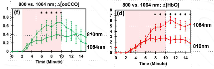 We see in this graph that 1064nm light produced 100% more oxygenated hemoglobin and cytochrome c oxidase in a trial involving stimulation with a laser to the forearm. Additionally, the application of 1070 nm PBM in clinical studies has led to improvements in cognitive tasks related to memory, attention, and processing speed in human subjects. Such targeted neurological benefits make the 1070 nm wavelength especially useful for conditions like Alzheimer’s disease, brain injuries, and cognitive decline associated with aging​.
